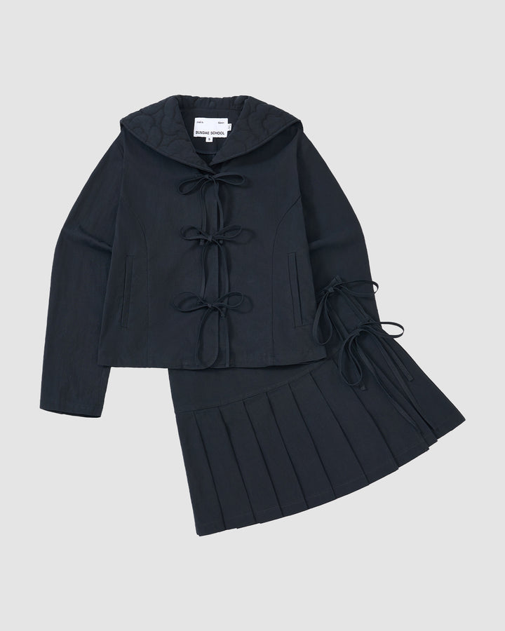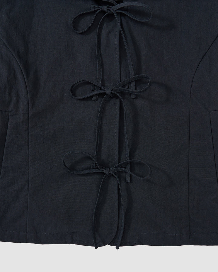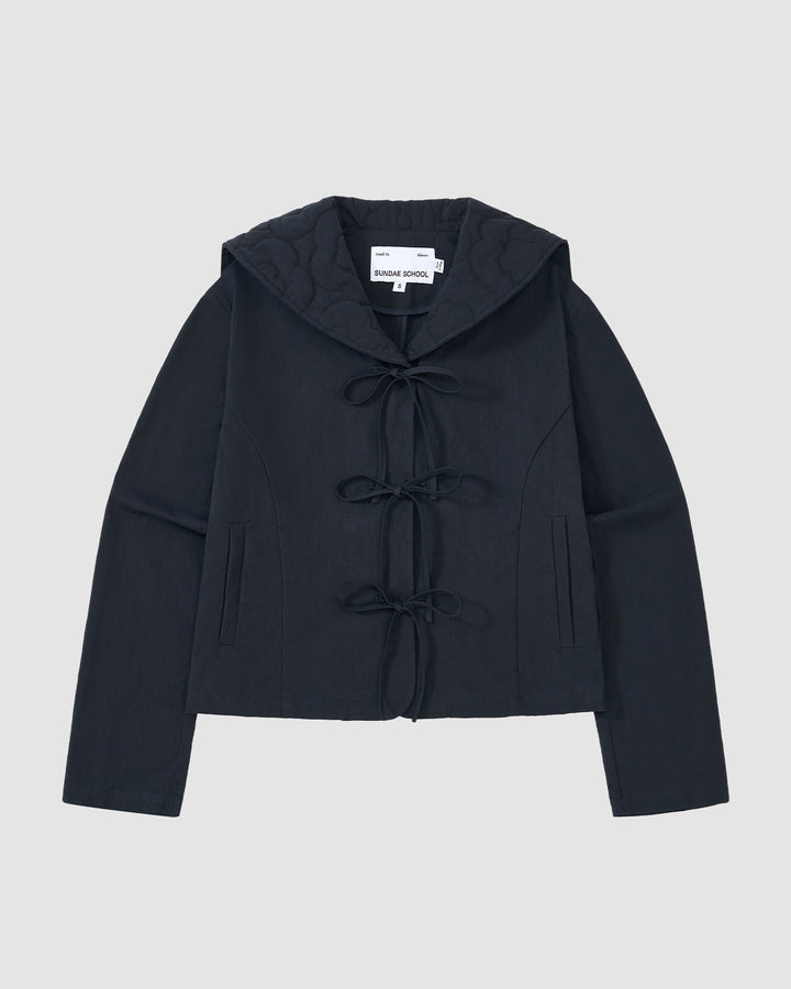 Close-up of Sundae School's NAVY SAILOR COLLAR UNIFORM JACKET in black, featuring three fabric bow ties down the front, visible seams, and curved side panel design.