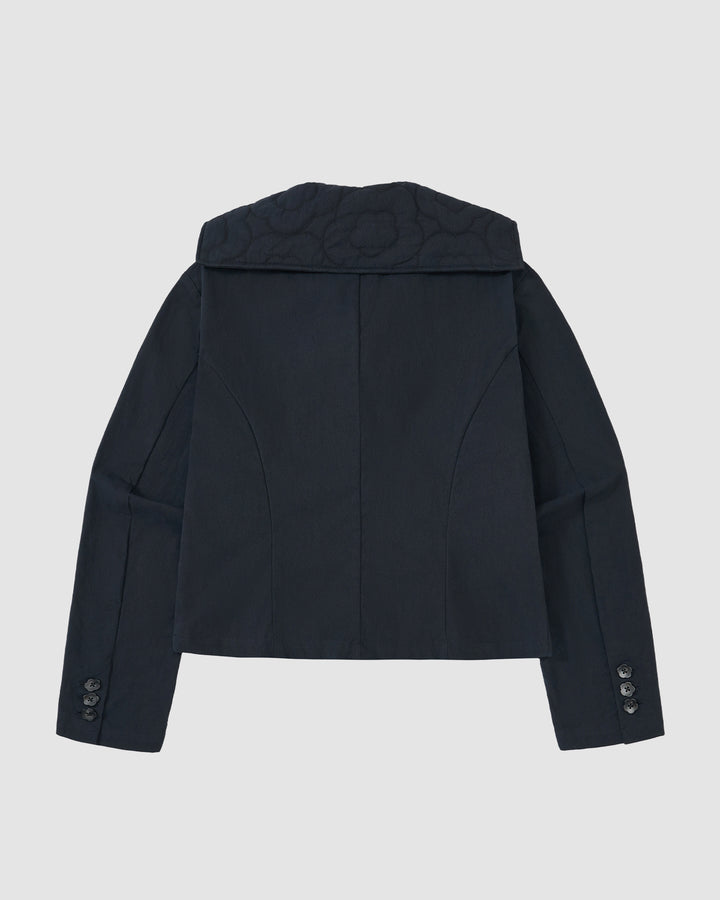 The NAVY SAILOR COLLAR UNIFORM JACKET by Sundae School is shown from the back, featuring a wide sailor collar, subtle seam details, buttoned cuffs on both sleeves, and a mochi quilted textured finish.