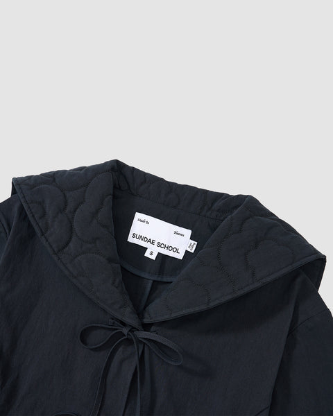 The NAVY SAILOR COLLAR UNIFORM JACKET by Sundae School features a dark navy hue, mochi quilted stitching, long sleeves, hood, front tie closures, two vertical pockets, and an inner collar label, shown on a light gray background.