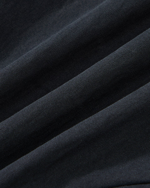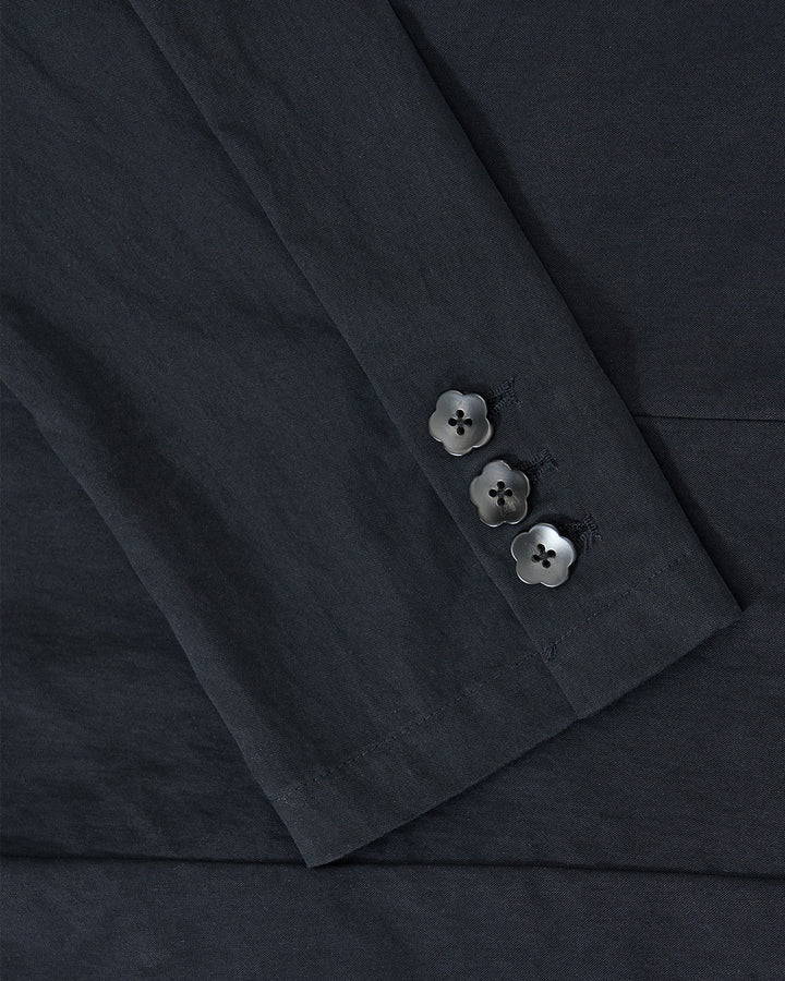 Close-up of Sundae School's NAVY SAILOR COLLAR UNIFORM JACKET shows dark, textured fabric with diagonal folds and a fine weave, highlighted by soft lighting that accentuates its subtle matte finish.