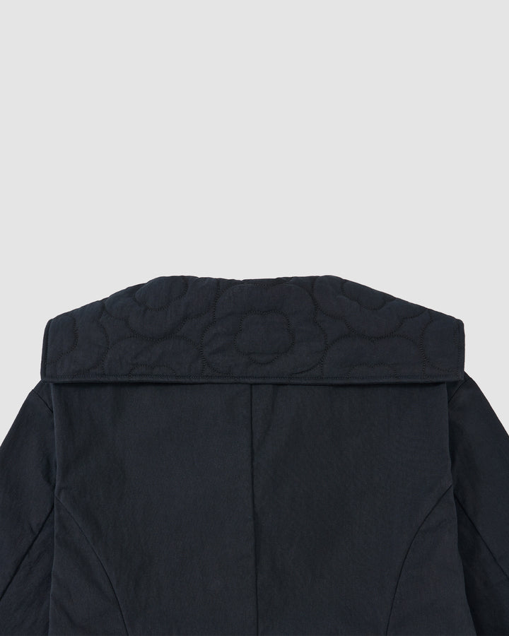 Close-up of the back of the NAVY SAILOR COLLAR UNIFORM JACKET by Sundae School, featuring mochi quilted floral stitching against a light gray background.