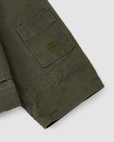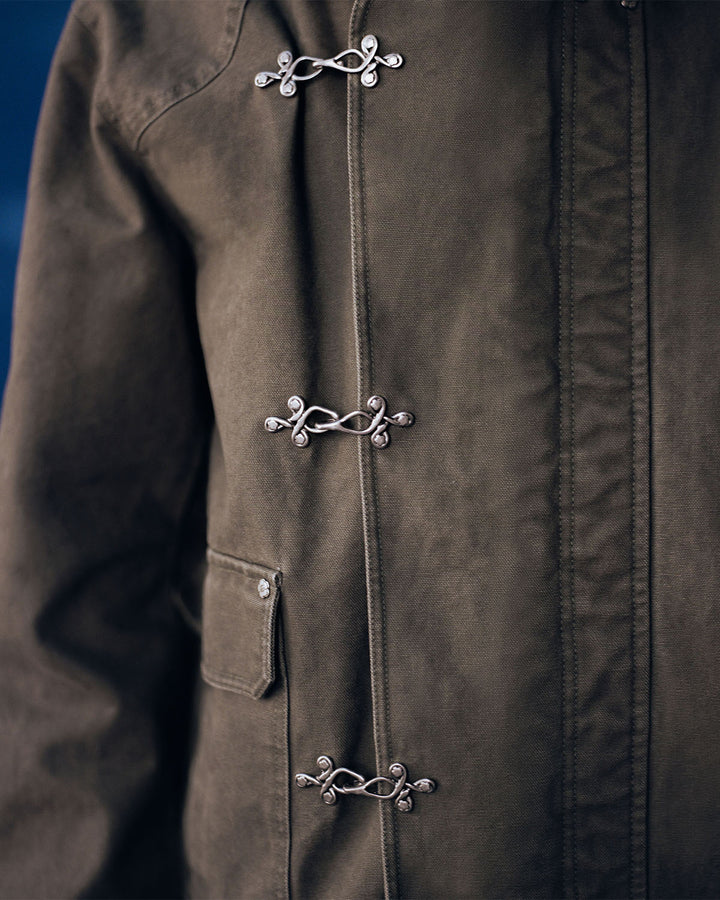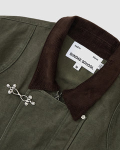 Close-up of Sundae School's [PRE-ORDER] OLIVE FIREMAN CLASP JACKET, a vintage-inspired cotton piece in olive green with silver fireman clasps and a side flap pocket, echoing classic workwear details.