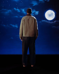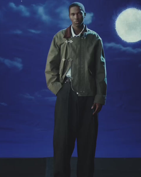 A man stands before a night sky with a full moon, wearing Sundae School's [PRE-ORDER] OLIVE FIREMAN CLASP JACKET, paired with dark wide-leg pants and brown shoes.
