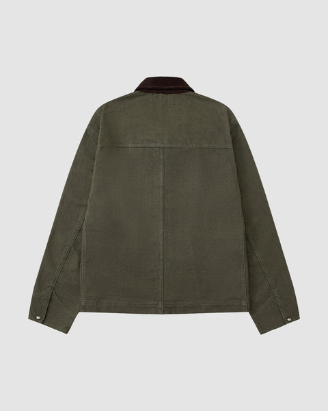 The Sundae School [PRE-ORDER] OLIVE FIREMAN CLASP JACKET is displayed from the back, with long sleeves, straight hem, visible seams, and a dark corduroy collar—classic workwear style against a plain light grey background.