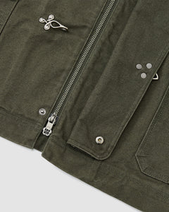 Close-up of the [PRE-ORDER] OLIVE FIREMAN CLASP JACKET by Sundae School, a vintage-inspired cotton workwear piece in olive green with a sturdy textured fabric, silver zipper, metal snap buttons, and decorative silver pins on the front pocket and flap.