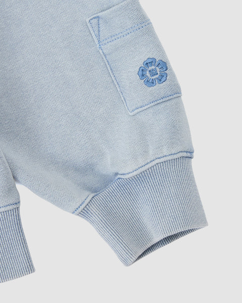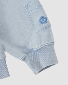 Close-up of Sundae School’s SKY BLUE COCOON HOODIE showing a light blue knit sleeve with ribbed cuff, peret sleeves, small pocket, and embroidered blue flower near the pocket for a soft cocoon-core vibe.