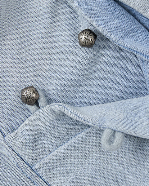 Close-up of the SKY BLUE COCOON HOODIE by Sundae School, featuring silver floral-engraved buttons, fabric loops, and detailed stitching—perfect for cocoon-core outfits or pieces with peret sleeves.