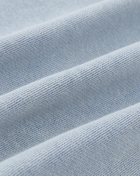 Close-up of the SKY BLUE COCOON HOODIE by Sundae School shows light blue, ribbed fabric with a fine woven texture and soft feel—ideal for cocoon-core looks or oversized hood styles.