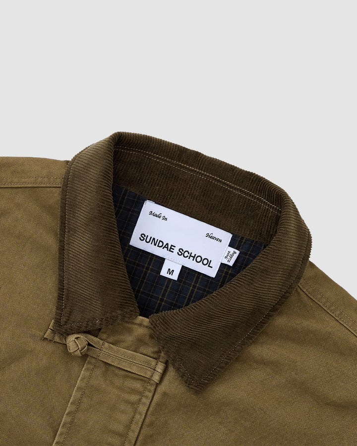 The Sundae School TAN KNOT BARN JACKET, featuring an olive green hue, three front patch pockets, a dark brown corduroy collar, and toggle button closures, is laid flat on a light gray background.