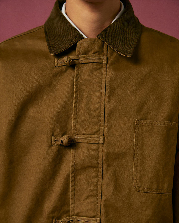 Close-up of Sundae School's TAN KNOT BARN JACKET, inspired by Joseon military workwear. Features a brown corduroy collar, visible metal zipper, fabric knot button, checked lining, and detailed stitching.