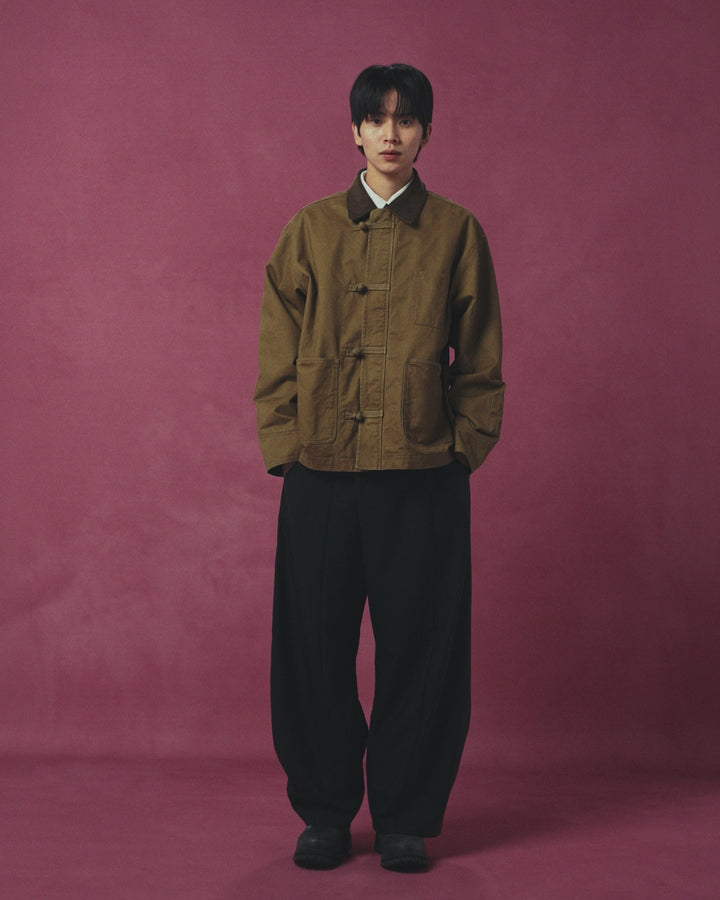 Joseon military energy meets chill temple monk vibes. Heritage workwear for the city monk arc. Enzyme-washed waxed chino gives you soft armor structure while still moving like normal clothes because protection shouldn’t mess with the flow.
