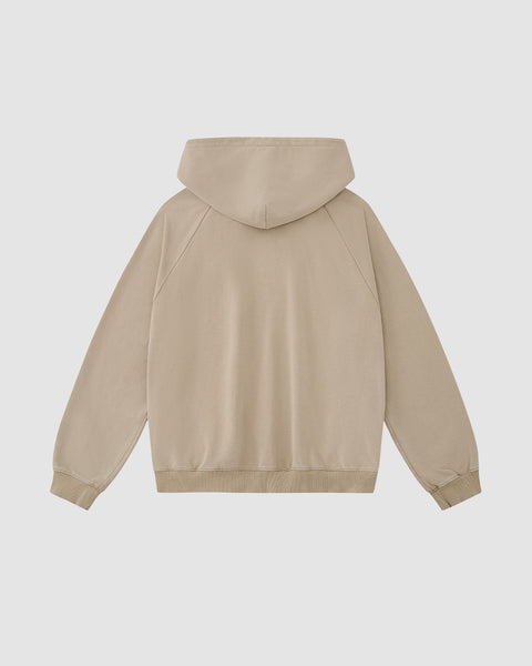 The Sundae School TAUPE HANBOK HOODIE is shown from the back, featuring long sleeves, ribbed cuffs and hem, a plain taupe design, and the brand’s signature sleeve stash pocket for added convenience and subtle style.