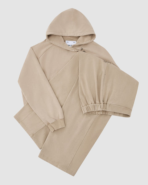 The TAUPE WRAP SWEATBAJI by Sundae School, a beige 100% cotton hoodie with long sleeves, angled seams, and elastic cuffs, is shown flat on a white background with one sleeve folded across the front.