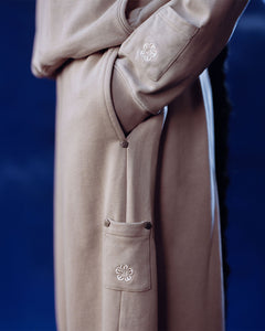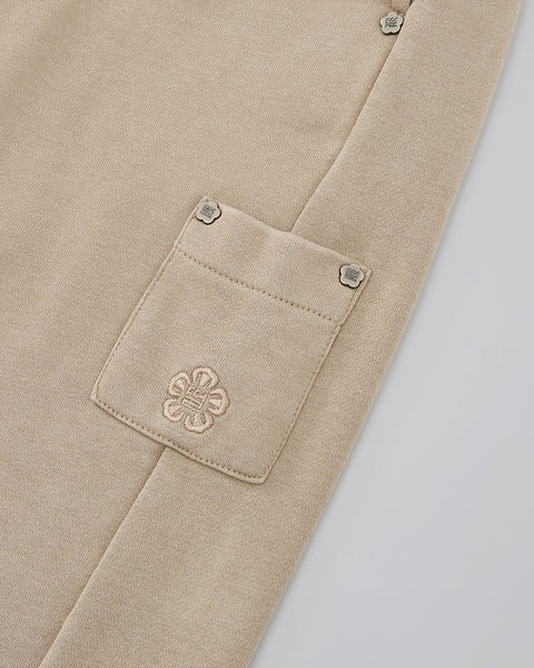 Close-up of the TAUPE WRAP SWEATBAJI by Sundae School: a beige 100% cotton garment with textured fabric, featuring a small rectangular pocket with embroidered floral design and two metallic snap buttons on the flap.
