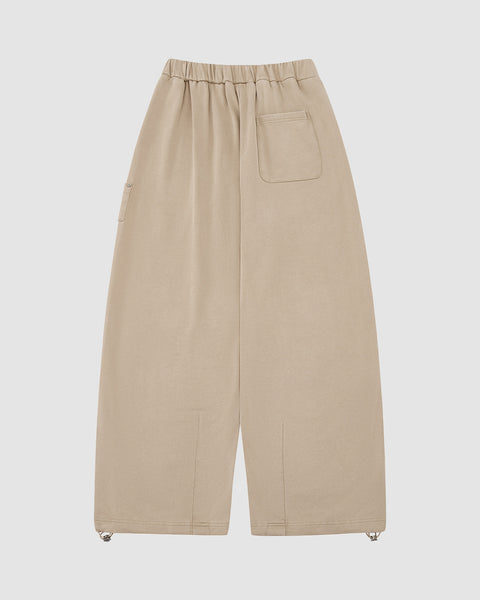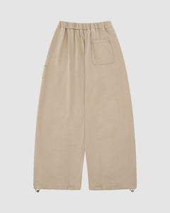 The TAUPE WRAP SWEATBAJI by Sundae School are Hanbok-inspired, wide-leg beige cotton pants with an elastic waistband, single back pocket, drawstring ankle hems, and a minimalist design.