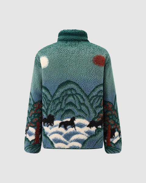The TEAL FIVE PEAKS FLEECE by Sundae School features a cozy embossed pile fleece with green mountains, trees, black bull-like animals, a red sun, and white moon inspired by Korean Sun and Moon painting.