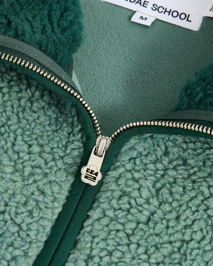 Close-up of the Sundae School TEAL FIVE PEAKS FLEECE jacket in teal and green, featuring a silver zipper, embossed pile fleece outer, smooth lining, and white, black, and blue shape patches.