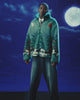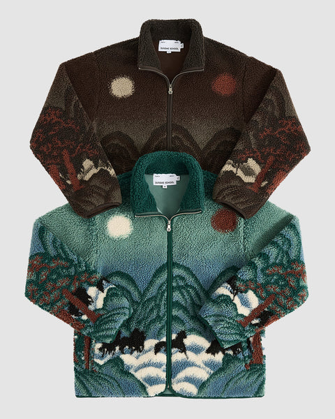 A person faces away wearing Sundae School's TEAL FIVE PEAKS FLEECE, a fuzzy green jacket with a landscape of hills, trees, and horses under a cloudy night sky and bright full moon.