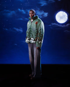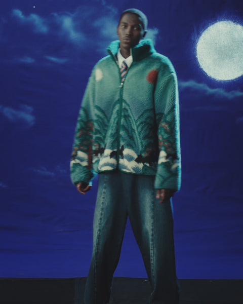 Under a dreamy, dark blue night sky with clouds and a full moon, a person wears Sundae School’s TEAL FIVE PEAKS FLEECE—green with nature patterns—and wide-legged jeans. The surreal atmosphere enhances the look.