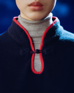 A close-up of a person wearing the Sundae School NAVY TEARDROP KNOT FLEECE, featuring red trim and a frog closure over a light gray ribbed turtleneck. Only the lower face and neck show against a blurred blue background.